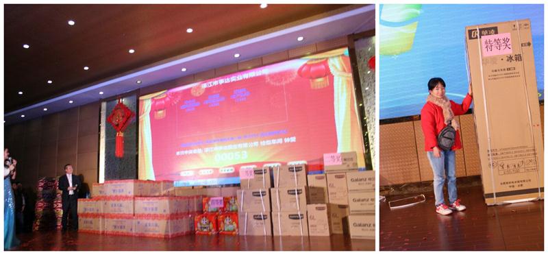 激動人心的抽獎活動令現(xiàn)場氣氛達到最高潮。當大屏幕滾動起來的時候,臺下的觀眾緊張、興奮地倒數(shù)三二一,個個屏住呼吸,都希望幸運降臨在自己身上。一輪又一輪,豪禮送不停。特等獎1名,一等獎2名,二等獎10名,三等獎20名,四等獎200名,中獎機會多多,獎品有大冰箱,微波爐,電磁爐,電壓力鍋等等。到此,大家都伸長脖子想知道,最終特等獎大冰箱花落誰家?沒錯,是質量部的黃婉鸝從在場近600名的員工眼皮下一舉奪走了價值兩千多塊的冰箱,成為今年的幸運兒。恭喜恭喜!