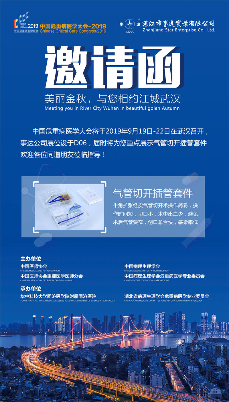 由中國醫(yī)師協(xié)會(huì)、中國醫(yī)師協(xié)會(huì)重癥醫(yī)學(xué)醫(yī)師分會(huì)、中國病理生理學(xué)會(huì)、中國病理生理學(xué)會(huì)危重病醫(yī)學(xué)專業(yè)委員會(huì)共同主辦,華中科技大學(xué)同濟(jì)醫(yī)學(xué)院附屬同濟(jì)醫(yī)院承辦的“中國危重病醫(yī)學(xué)大會(huì)(CCCC2019)”將于 2019 年 9 月19 日 -22 日在武漢召開。2009 年 7 月中國醫(yī)師協(xié)會(huì)重癥醫(yī)學(xué)醫(yī)師分會(huì)在濟(jì)南成立。2009-2019,十年風(fēng)雨歷程,十個(gè)春華秋實(shí)。分會(huì)自成立以來,秉承“規(guī)范行業(yè)行為,維權(quán)自律并重”的宗旨,與中國病理生理學(xué)會(huì)危重病醫(yī)學(xué)專業(yè)委員會(huì)共同致力于建立重癥醫(yī)學(xué)培訓(xùn)體系,普及重癥醫(yī)學(xué)知識(shí)與技能,加強(qiáng)學(xué)科人才隊(duì)伍建設(shè),促進(jìn)重癥醫(yī)學(xué)持續(xù)健康發(fā)展,推動(dòng)重癥醫(yī)學(xué)領(lǐng)域改革與創(chuàng)新。